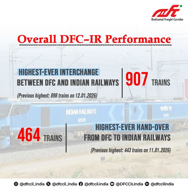 NEW DELHI : DFCCIL marked Republic Day 2026 with a landmark achievement in national freight operations, delivering record train efficiency across its network. The day witnessed the highest-ever aggregate interchange between the Dedicated Freight Corridors and Indian Railways, along with the highest hand-over volumes from DFC to Indian Railways. A total of 907 freight trains were interchanged in a single day, surpassing the previous best of 898 trains recorded on 12.01.2026 and reflecting strengthened coordination and throughput across the national freight network.
