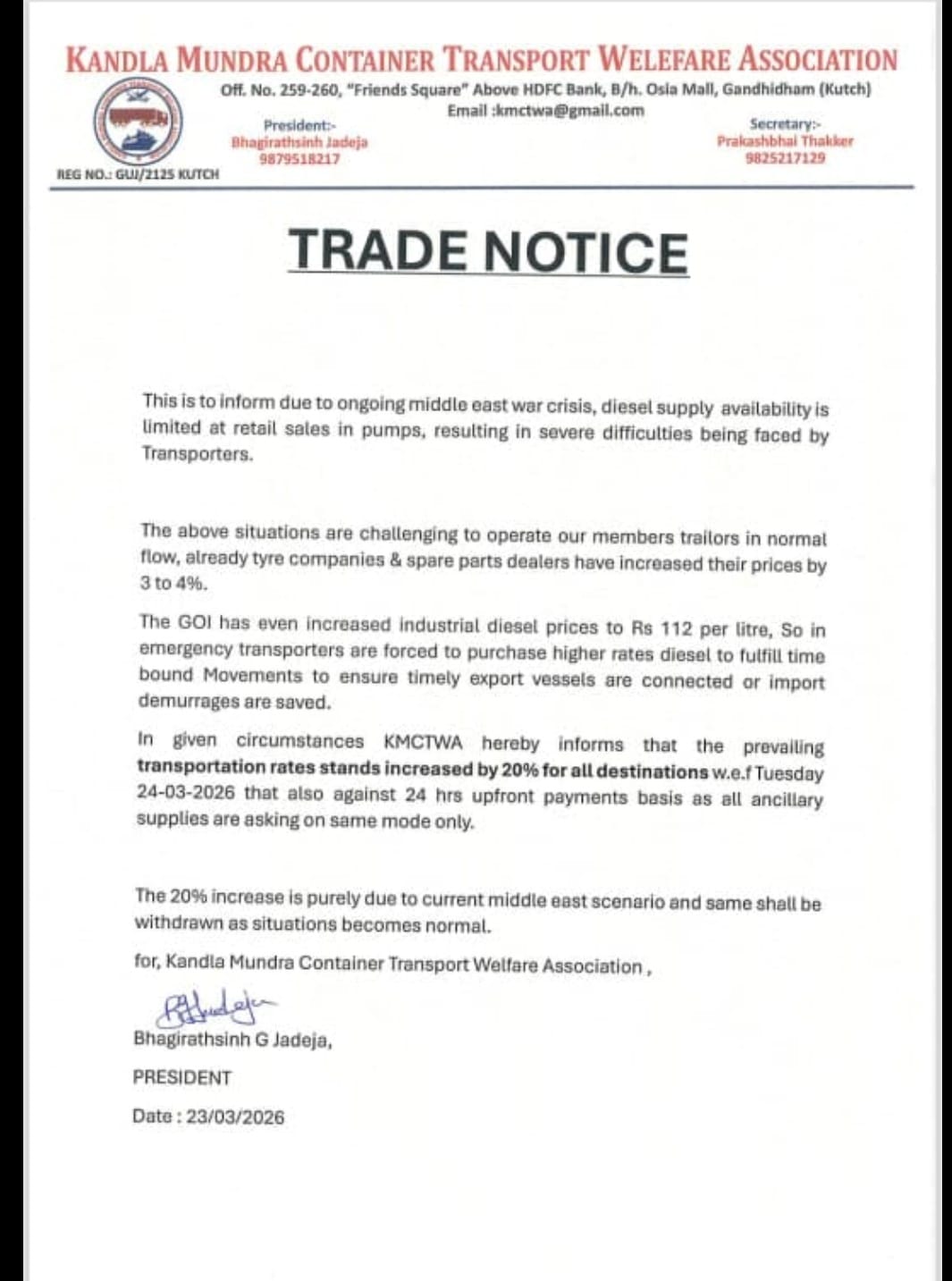 GANDHIDHAM: In a significant development impacting container logistics in western India, the Kandla Mundra Container Transport Welfare Association (KMCTWA) has announced a 20% increase in transportation rates across all destinations, effective March 24, 2026. The decision comes amid escalating operational challenges triggered by a diesel supply crunch linked to the ongoing Middle East geopolitical crisis.