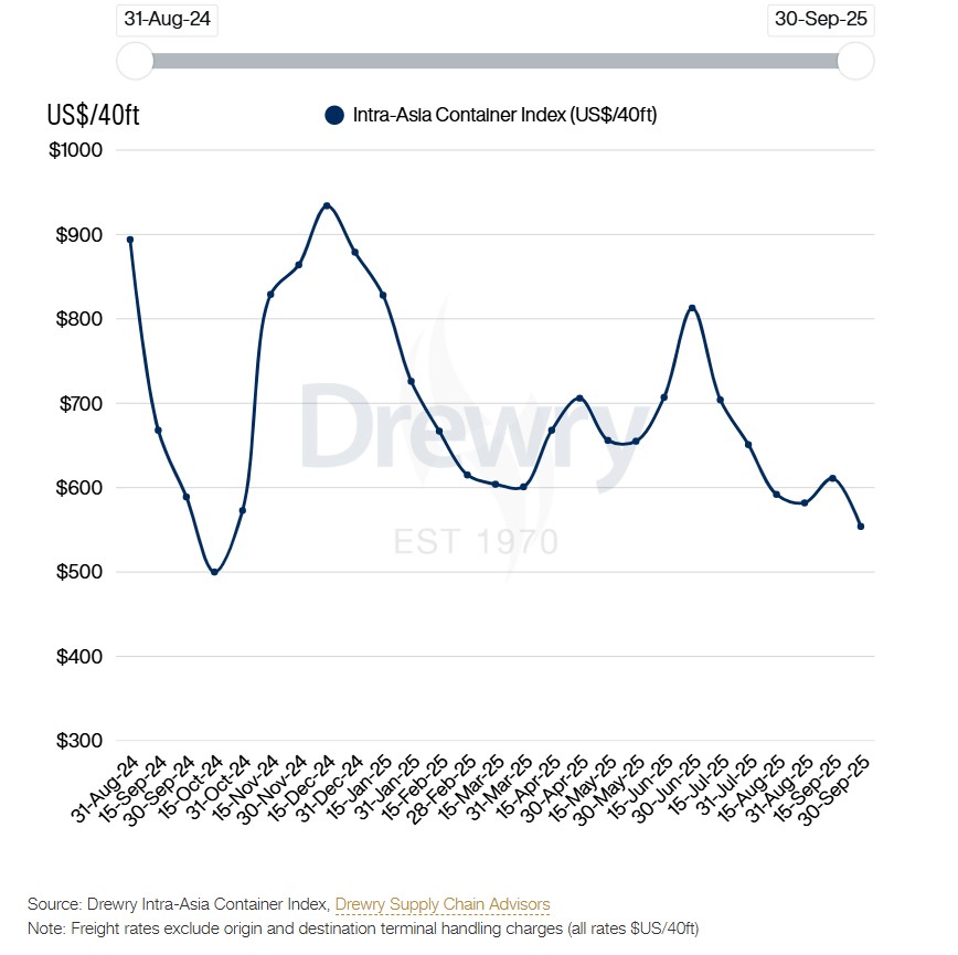 LONDON: Drewry’s Intra-Asia Container Index (IACI), a weighted average of regional spot container freight rates, decreased 9% in the fortnight to 30 Sep 25 to $554 per 40ft container.