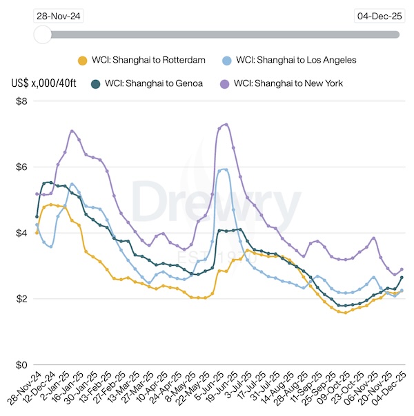 Spot rates on the Shanghai–Genoa route increased in double digits, rising 15% to $2,648 per 40ft container, while rates from Shanghai to Rotterdam edged up 4% to $2,241 per 40ft container. In contrast to the Transpacific trade route, Asia–Europe has successfully sustained rate levels for three consecutive weeks, leveraging FAK increases to support spot rates before annual contract talks begin.The uncertainty surrounding the Suez Canal is adding volatility to the Asia–Europe trade lanes since carriers continue to view the Suez as the natural route between the two regions. A full resumption of transits would return significant capacity to the market and exert downwards pressure on rates, although the effect would likely be gradual due to the possible congestion at ports following the realignment of East–West networks.