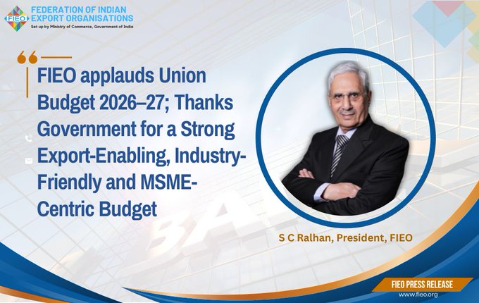 NEW DELHI : The Federation of Indian Export Organisations (FIEO) warmly welcomes the Union Budget 2026–27 and compliments the Government for presenting a bold, forward-looking, and reform-oriented Budget that significantly strengthens India’s growth trajectory while decisively enhancing the global competitiveness of Indian exports, manufacturing and MSMEs.