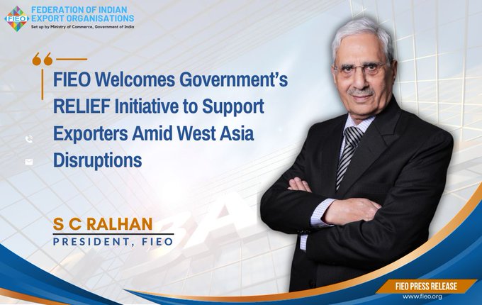 NEW DELHI : Mr S C Ralhan, President, Federation of Indian Export Organisations (FIEO) has warmly welcomed the Government’s timely and proactive announcement of the RELIEF (Resilience & Logistics Intervention for Export Facilitation) initiative under the Export Promotion Mission, aimed at supporting exporters impacted by the ongoing disruptions in West Asia maritime trade routes.