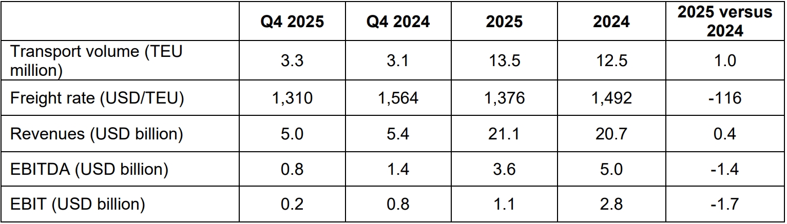 Robust growth in global trade and the new Gemini Network led to an 8% increase in the transport volume, to 13.5 million TEU. At the same time, the average freight rate fell by 8% compared to the prior year, to 1,376 USD/TEU. Higher costs due to the ongoing rerouting of ships via the Cape of Good Hope and start-up expenses for the Gemini Network, weighed on the annual results. On the other hand, Gemini related cost savings started kicking in during the second half of 2025 and will be fully realized in 2026. One-time non-cash effects in the fourth quarter had a positive impact.