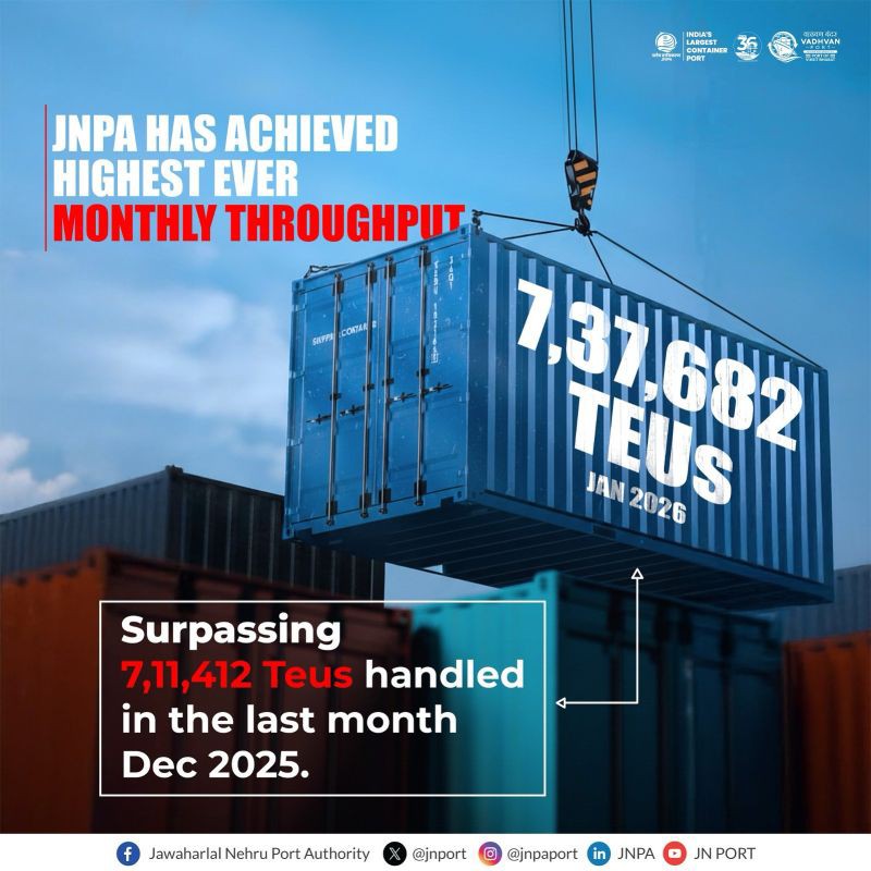 MUMBAI : Jawaharlal Nehru Port Authority (JNPA) has achieved a historic milestone by recording its highest-ever monthly container throughput of 7,37,682 TEUs in January 2026, surpassing the previous record of 7,11,412 TEUs registered in December 2025.