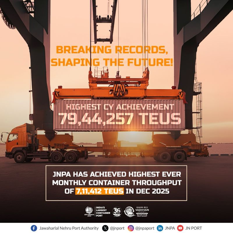 MUMBAI : Jawaharlal Nehru Port Authority (JNPA) has achieved a historic milestone in Calendar Year 2025, recording its highest-ever annual container throughput of 7,944,257 TEUs, reflecting a robust year-on-year growth of 12.64%.