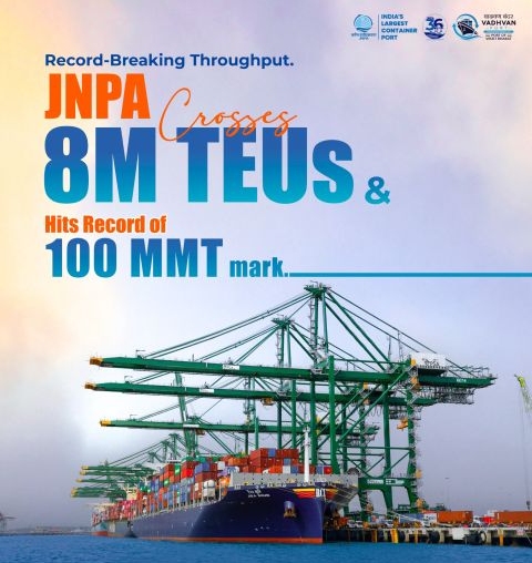 MUMBAI: Jawaharlal Nehru Port Authority (JNPA), India’s premier container port, has achieved a landmark milestone by surpassing 8 million TEUs in container throughput during FY 2025–26 (year-to-date). The port has also recorded its highest-ever annual performance, with total cargo handling reaching an impressive 100 million metric tonnes (MMT).
