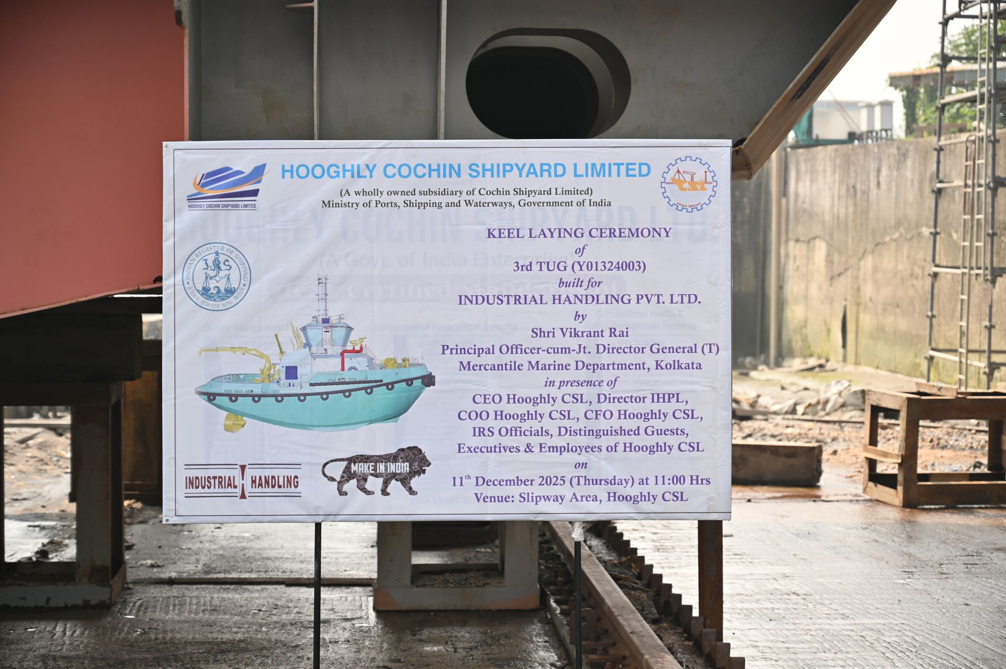 KOLKATA : Hooghly Cochin Shipyard Ltd (HooghlyCSL), a wholly owned subsidiary of Cochin Shipyard Limited, marked another significant milestone in its shipbuilding roadmap with the keel laying ceremony of the 3rd and 4th 40T (@90% MCR) Bollard Pull ASD Tugs. The ceremony was conducted at the company’s Nazirgunge Yard on 11 December 2025, in the presence of senior officials from HooghlyCSL, Cochin Shipyard Ltd, and representatives of the owner, Industrial Handling Pvt. Ltd.