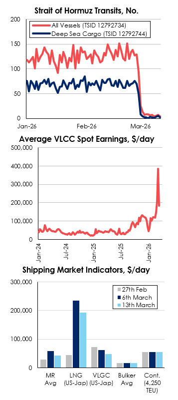 - Strait of Hormuz transits down 95% on pre-conflict levels (av. 5 transits per day past week vs ~125 pre-conflict).