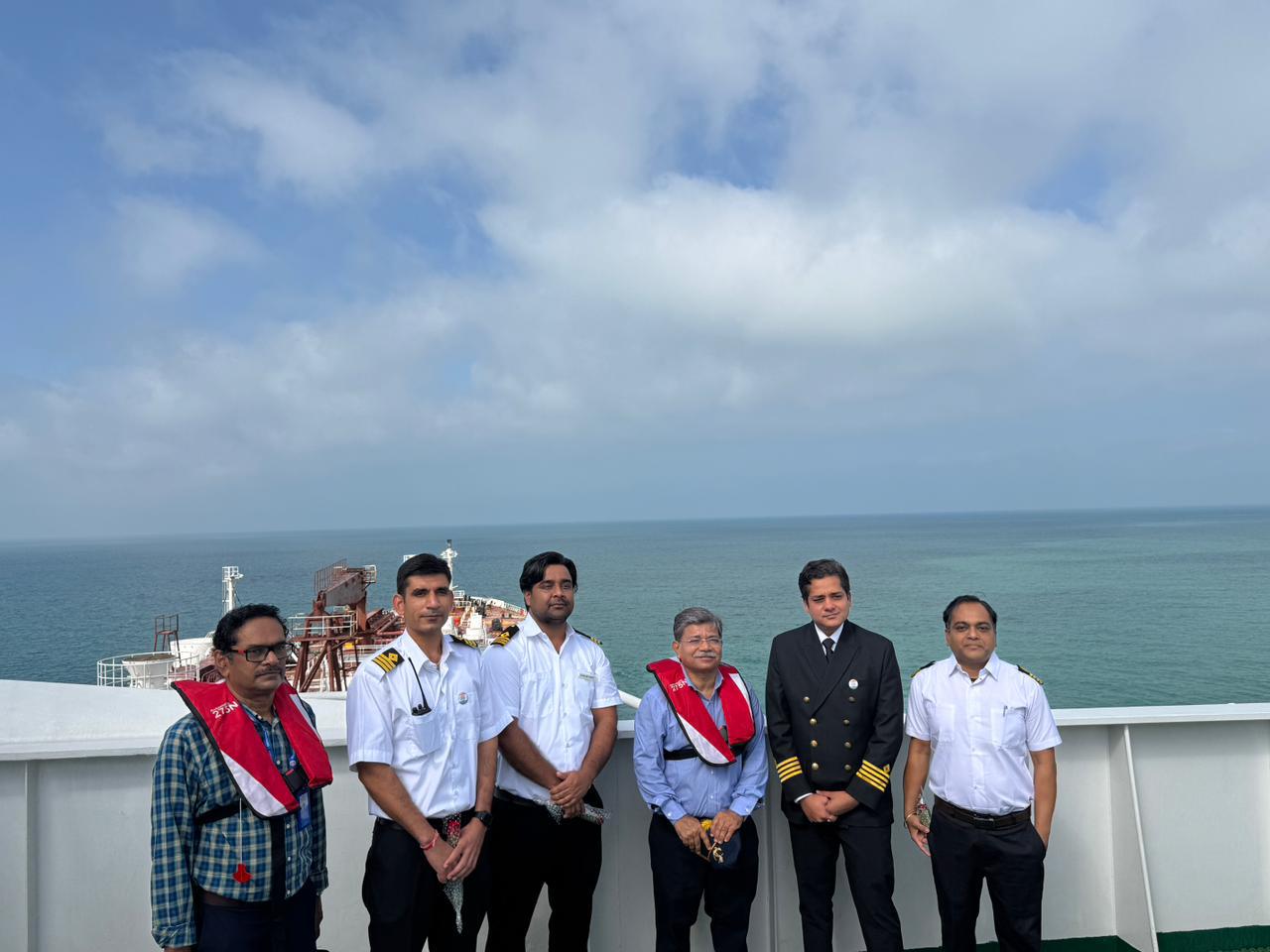 On this occasion, Shri Sushil Kumar Singh, IRSME, Chairman of Deendayal Port Authority, visited onboard MT Nanda Devi to oversee the arrangements and facilitate smooth operational coordination. During his visit, he interacted with the Captain and crew of the mother vessel, appreciating their professionalism and dedication in executing complex maritime operations safely and efficiently.