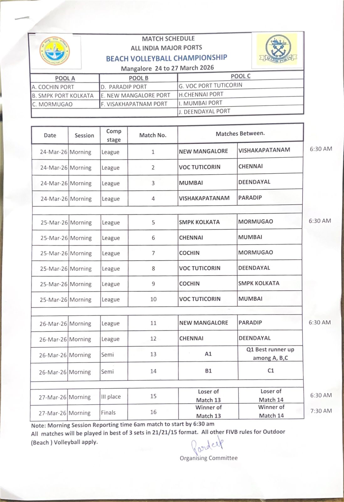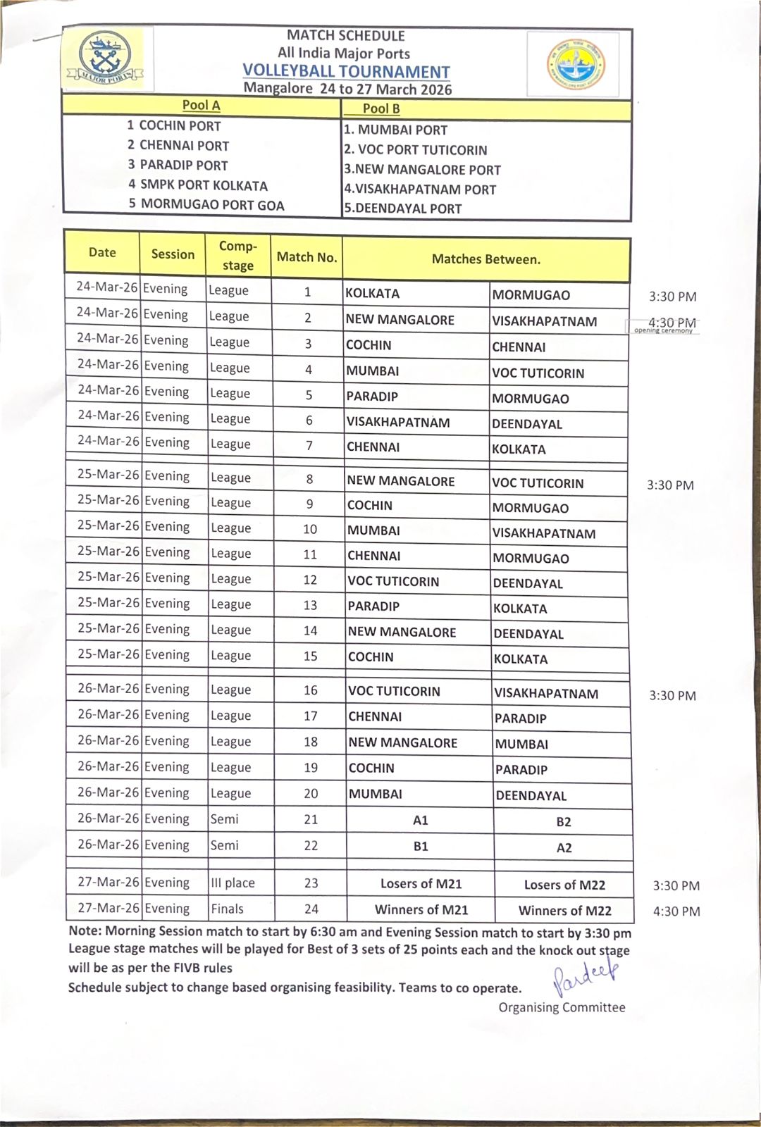 MANGALURU : The Major Ports Sports Control Board, in association with the New Mangalore Port Sports Council, will be hosting the 47th All India Major Ports Volleyball & 21st Beach Volleyball Tournaments 2025–26 at the NMPA Sports Complex Premises & Panambur Beach from 24th March to 27th March 2026. The event will be inaugurated on 24th March in the NMPA sports complex at 5:00PM by SMt. S. Shanthi, Deputy Chairperson, NMPA.