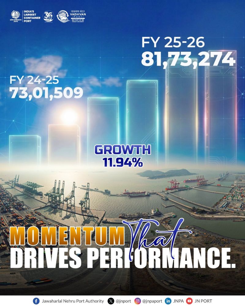 MUMBAI : Jawaharlal Nehru Port Authority (JNPA) has achieved a historic milestone by recording its highest-ever annual container throughput of 8.17 million TEUs (MTEUs) in FY 2025–26, surpassing the previous year’s throughput of 7.30