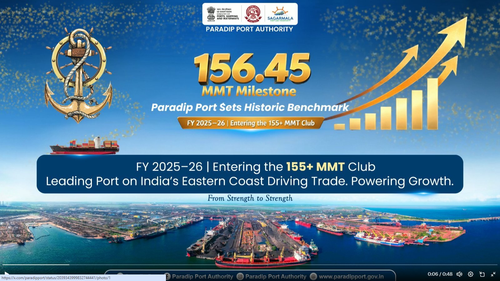 PARADIP : Paradip Port has scripted a new chapter in its operational history by achieving an all-time high cargo handling of 156.45 million metric tonnes (MMT) during the financial year 2025–26. This remarkable performance
