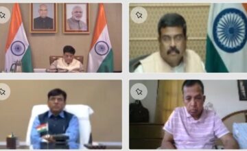 NEW DELHI : Union Minister of Ports, Shipping and Waterways Shri Mansukh Mandaviya, Minister of Railways, Commerce & Industry, Consumer Affairs, and Food & Public Distribution Shri Piyush Goyal, along with the Minister of Petroleum and