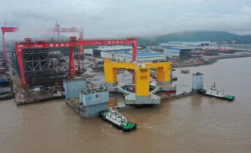 ZHOUSHAN : China’s first floating wind foundation platform rolled out yesterday from the Wison Offshore & Marine yard in Zhoushan. The 91-metre by 32-metre semisub foundation will be used to mount the world’s first