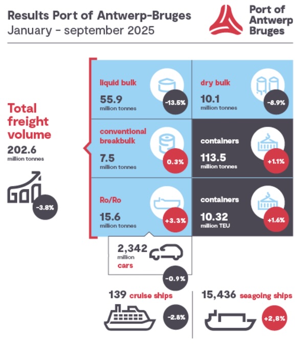 ANTWERP: In the first nine months of 2025, Port of Antwerp-Bruges handled 202.6 million tonnes of maritime goods, a decrease of 3.8% compared with the same period last year. The throughput of general cargo, including containers, conventional general cargo and RoRo, increased by 1.3%, while dry and liquid bulk together declined by 12.8%. Following a solid first half of the year, container volumes eased from August onwards, partly as a result of the phase-out of former shipping alliances. Trade with the United States continues to be affected by ongoing uncertainty surrounding US import tariffs.