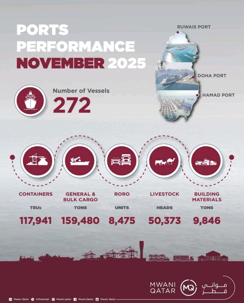 DOHA: Qatar’s ports delivered one of their strongest monthly performances in recent years, with cargo volumes rising sharply in November and vessel activity continuing to recover across Hamad, Ruwais and Doha ports.