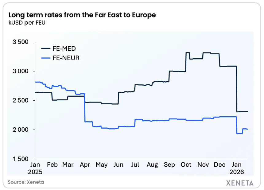 The start of 2026 has brought lower long term rates for shippers on the Europe-bound fronthauls from Far East.