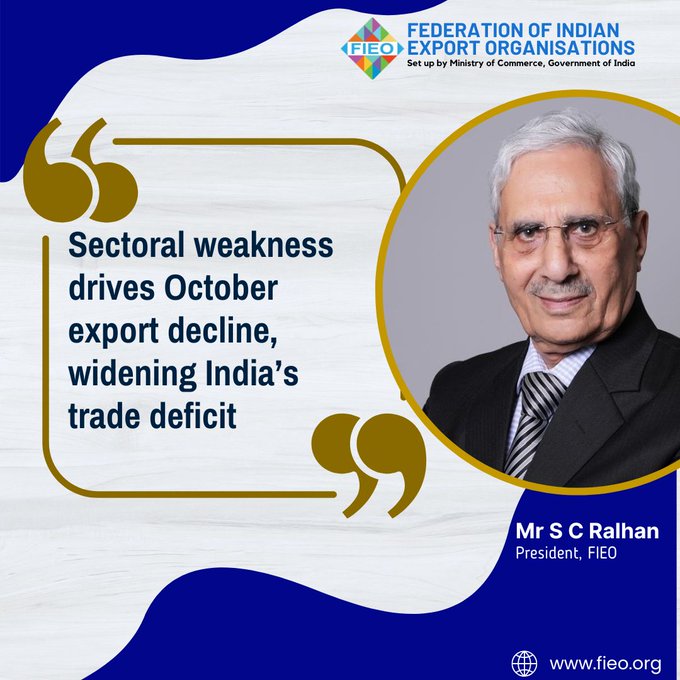 NEW DELHI : Reacting to the October trade data, FIEO President, Mr S C Ralhan, said that the latest figures reflect a mixed trend, with a marginal decline in overall exports and a significant rise in imports, resulting in a wider trade deficit. India’s overall exports for October 2025 stood at US$ 72.89 billion, slightly lower than US$ 73.39 billion recorded in October 2024. Imports, however, increased sharply to US$ 94.70 billion, up from US$ 82.44 billion last year, leading to an overall trade deficit of US$ 21.80 billion for the month.