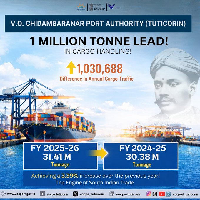 TUTICORIN : V.O. Chidambaranar Port Authority (VOC Port), Tuticorin, has achieved a significant milestone by registering a cargo handling lead of more than one million metric tonnes over the previous financial year, underscoring its strong operational performance and growing importance in regional maritime trade.