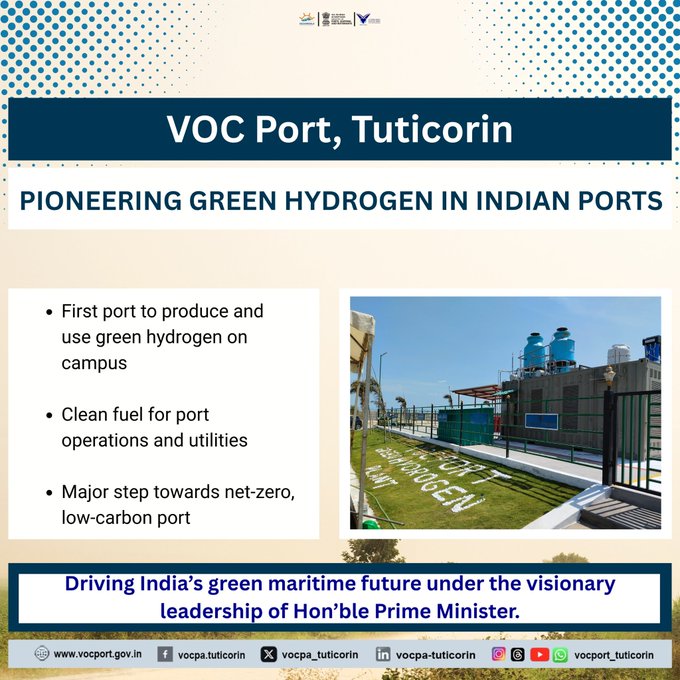 TUTICORIN : V.O. Chidambaranar Port Authority (VOCPA), Tuticorin, has marked a major milestone in India’s green maritime transition by becoming the first port in the country to produce and utilise green hydrogen within its campus.