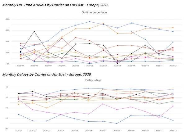Average Carrier Reliability on Far East – Europe, 2025