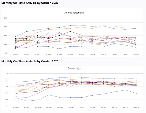 - Pacific International Lines (27% on-time, -4.2 days delayed)